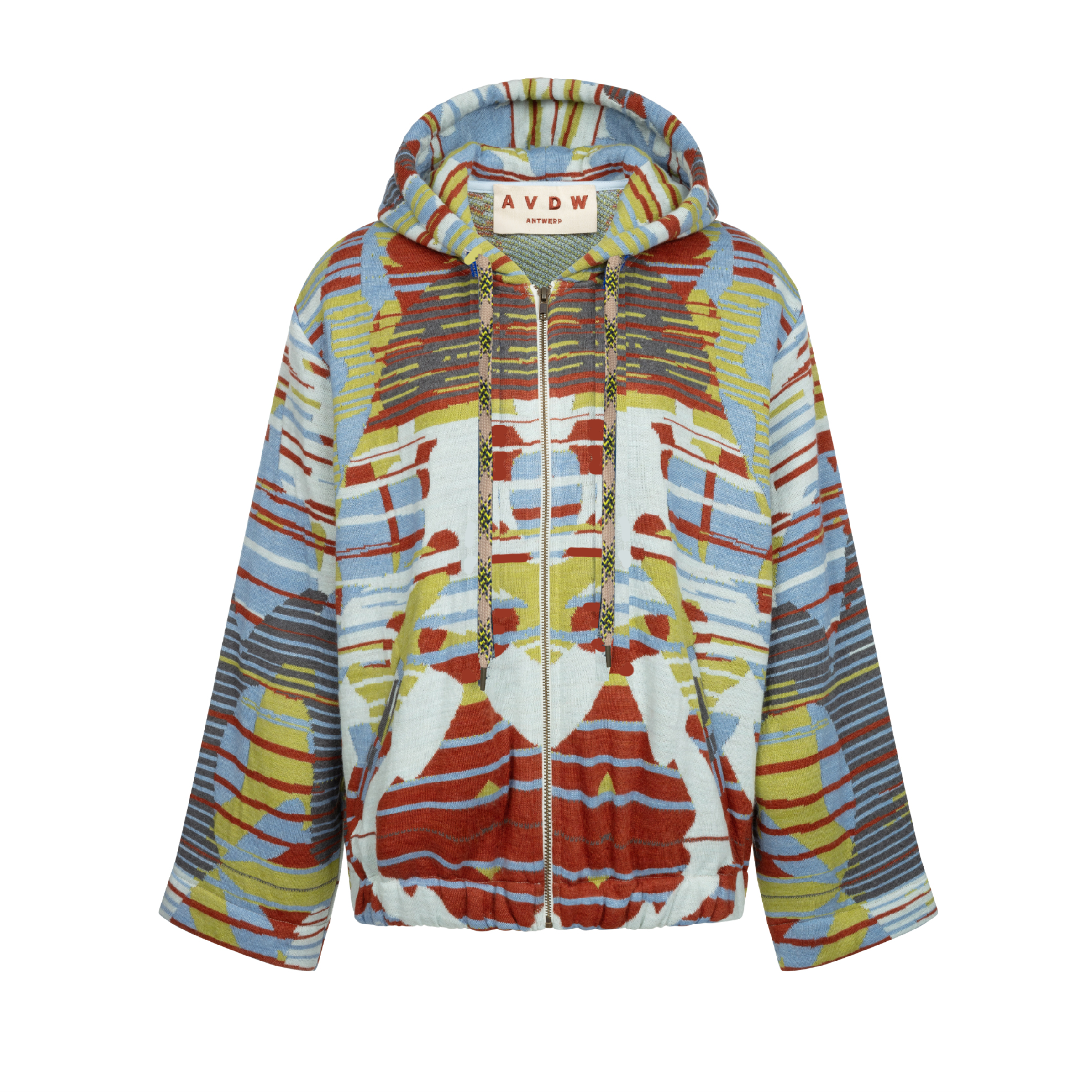 A vibrant zip-up hoodie featuring a bold multicolour abstract pattern. Designed with a relaxed fit, adjustable hood, and elasticated hem for effortless comfort. A statement piece that brings colour and individuality to any casual look.