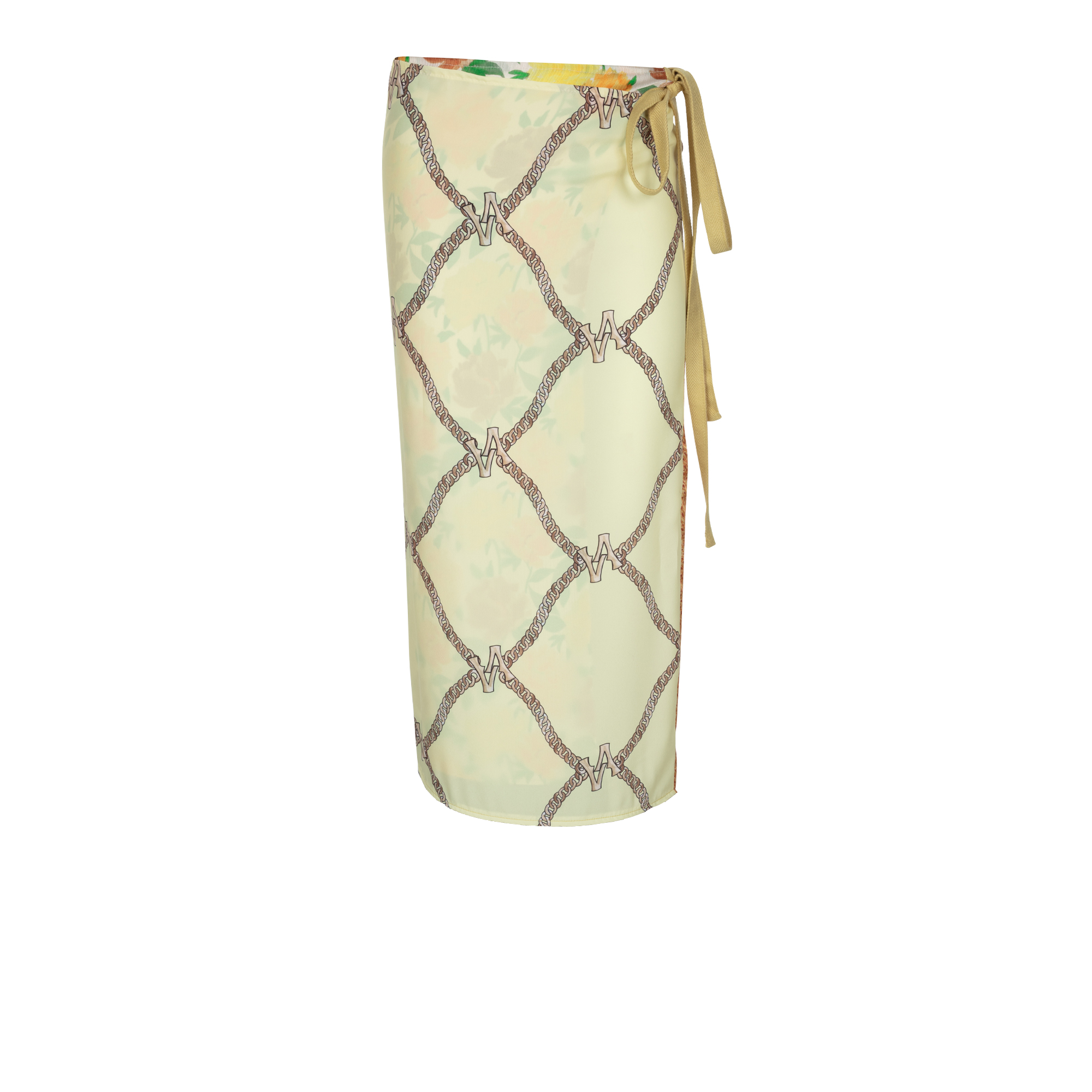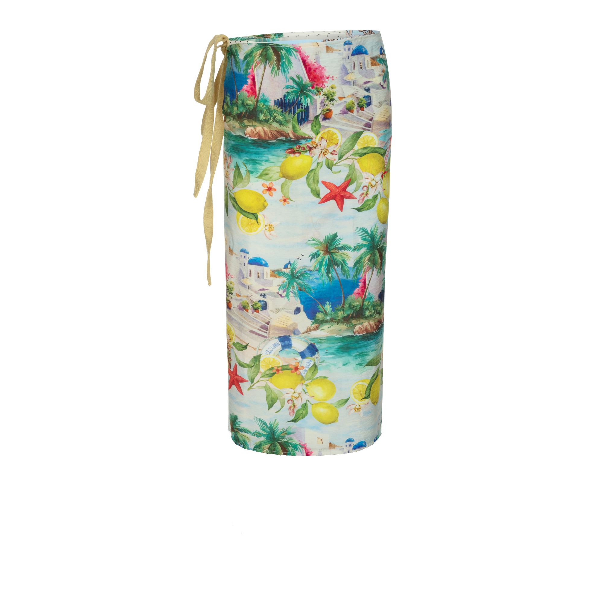 Wrap pareo in fluid mixed-fiber fabric, featuring two distinct prints that can be styled to the front for a different look.