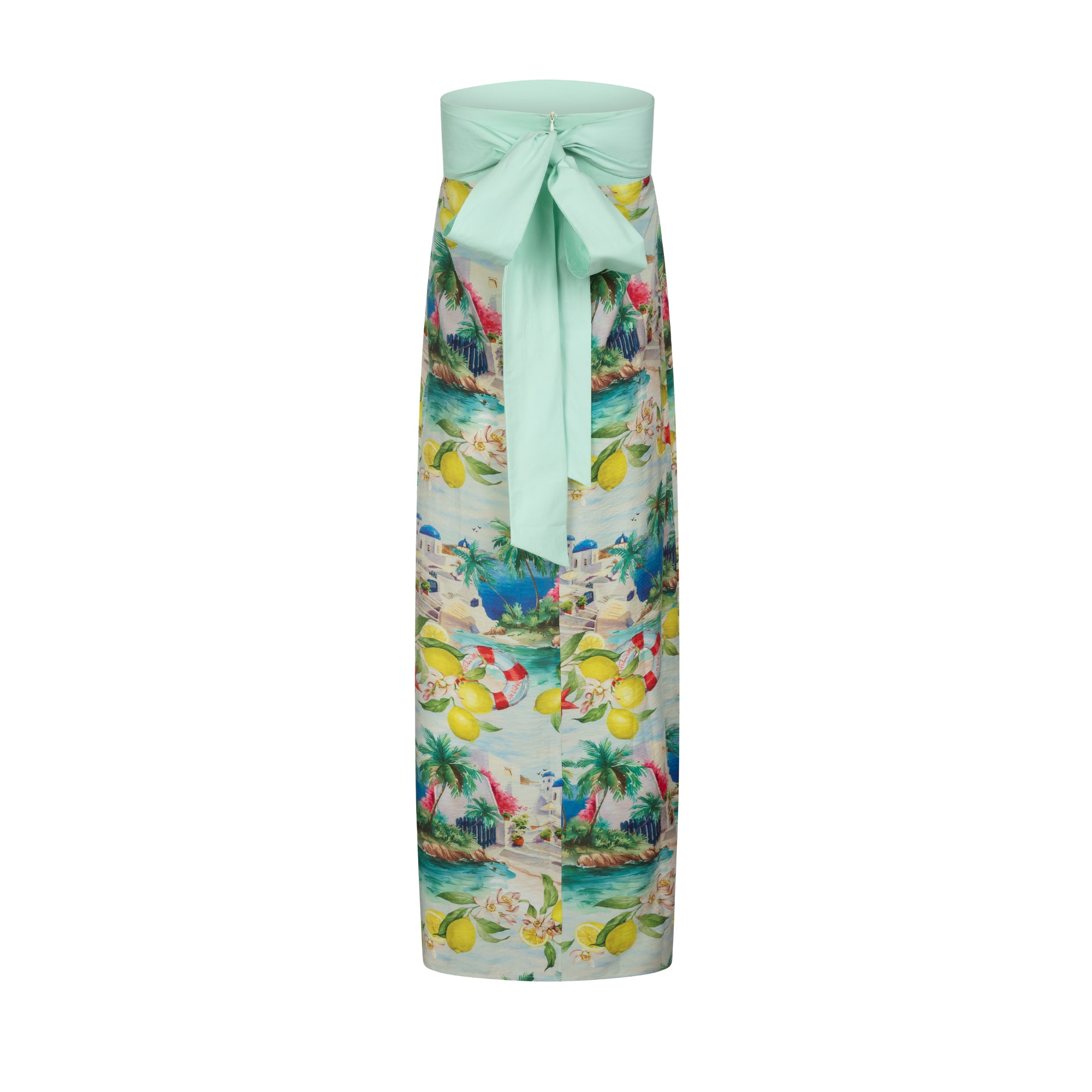Strapless bustier dress in fluid viscose featuring the vibrant Sardegna print. The fitted bodice is balanced by a straight, floor-length silhouette, while the statement bow detail at the back adds a feminine and sculptural finish.