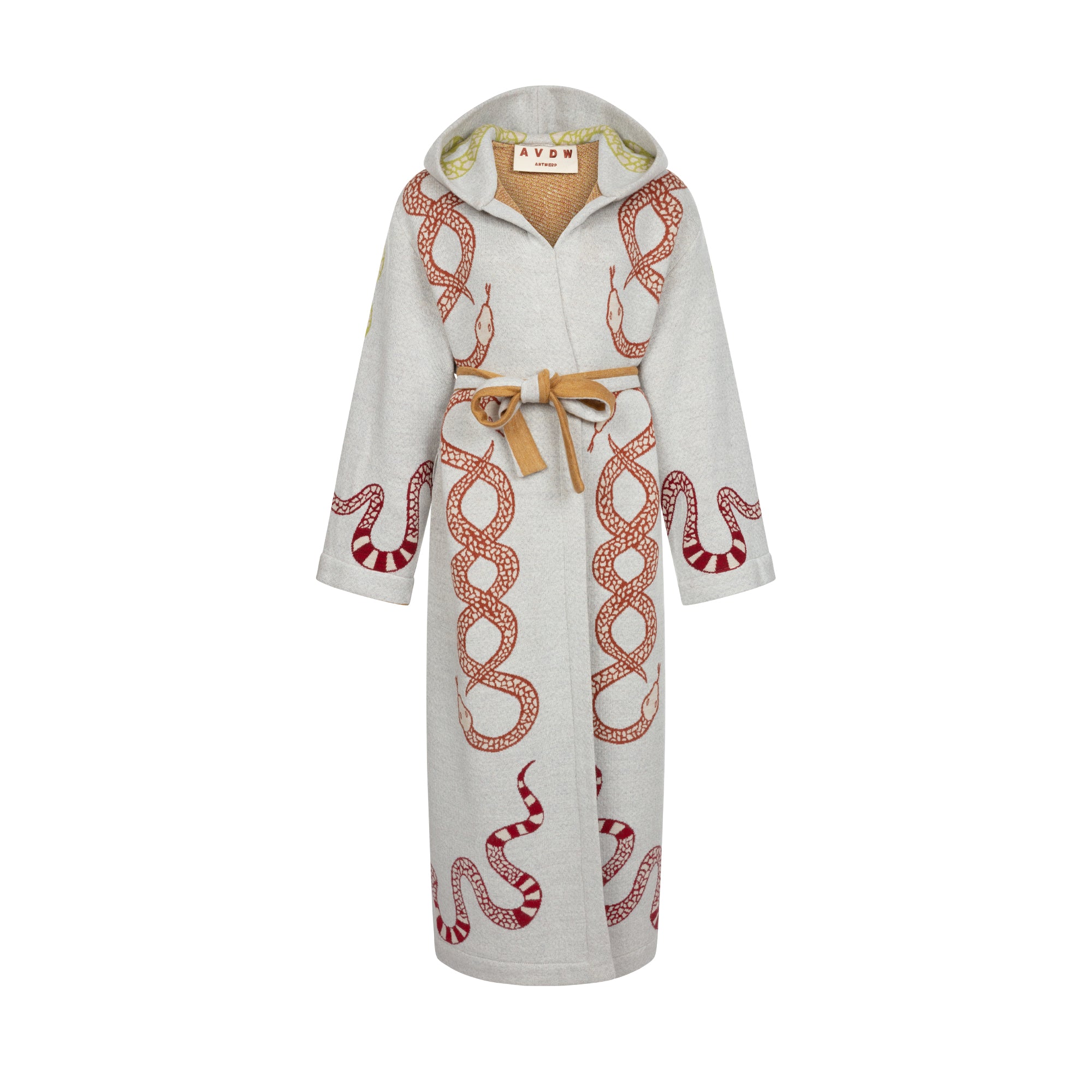 A statement long coat crafted from 100% premium wool, featuring an intricate snake motif in rich contrasting tones. Designed with a hood, a soft belt tie, and a relaxed silhouette for maximum comfort and visual impact. An eye-catching piece that effortlessly blends artistry with warmth.